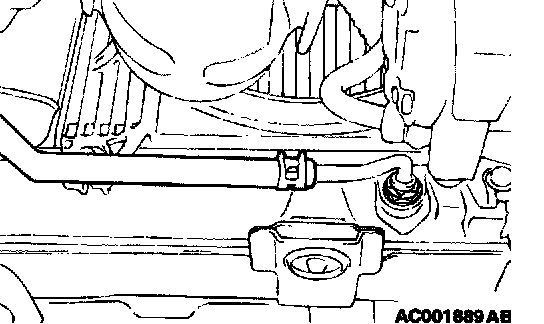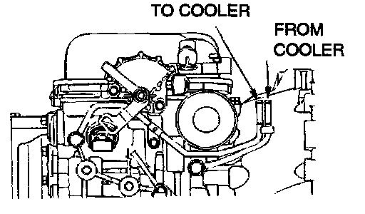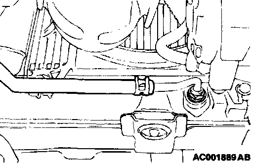 1. Disconnect the hose shown in the illustration which connects the transaxle and the oil cooler (inside the radiator). Place a container under the hose to collect the discharge.