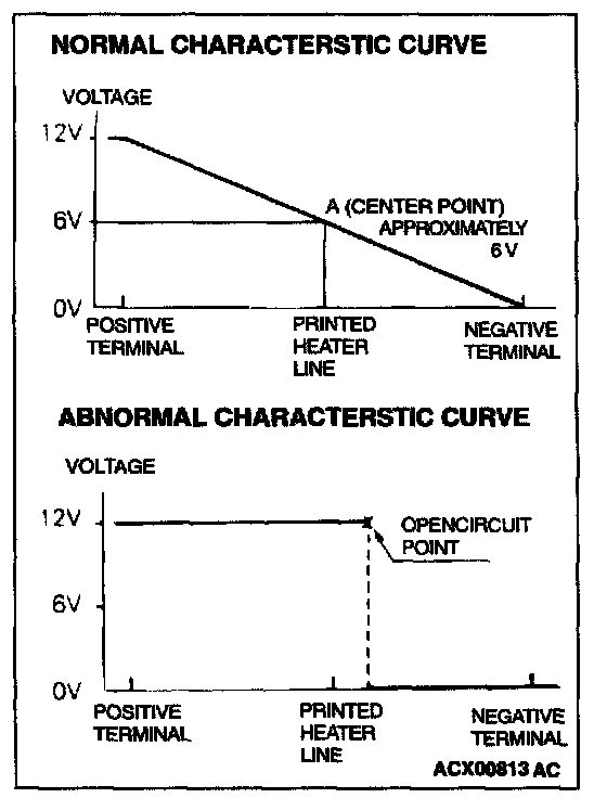 2. Turn "ON" rear window defogger switch. Measure heater element voltage with circuit tester at rear window glass center A. Condition is good if it indicates about 6 V.