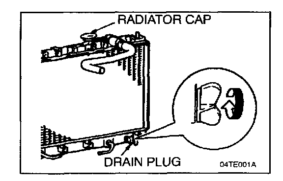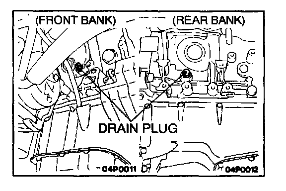 2. Loosen the radiator drain plug, remove two drain plugs from the engine block (one for each bank) and remove the radiator cap to discharge the coolant.