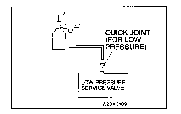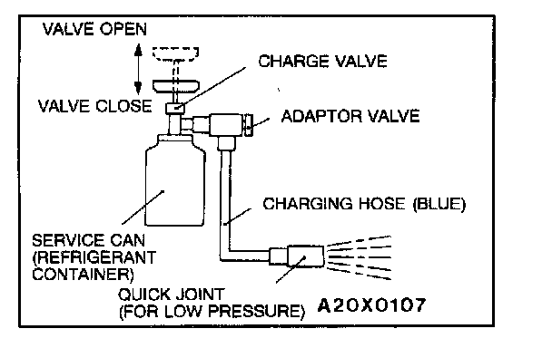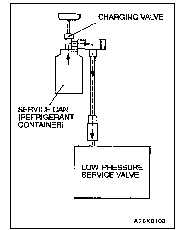 CORRECTING LOW REFRIGERANT LEVEL IN CASE THE SERVICE CAN IS USED1. Install the charge valve with the handle turned all the way out (valve open) of the service can.