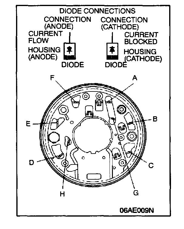 1. Apply the negative test probe of the diode tester or a multimeter with a diode test feature to the positive heatsink and the positive probe alternatively to A, B and C, a low resistance reading, or the forward voltage drop across the diode should be obtained. Reverse the test probes, a high resistance reading or a higher reverse voltage should be obtained.