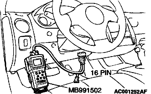 CAUTION: To prevent damage to scan tool MB991502, always turn the ignition switch to the "LOCK" (OFF) position before connecting or disconnecting scan tool.