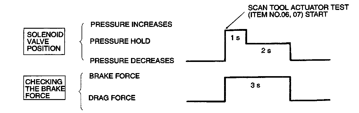 6. Turn the wheel by hand and check the change in braking force. Use a braking force tester. The braking force reading value should change when the actuator test is carried out. The result should be as shown in the diagram.