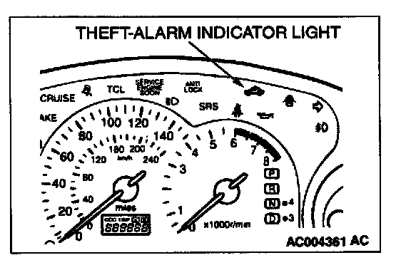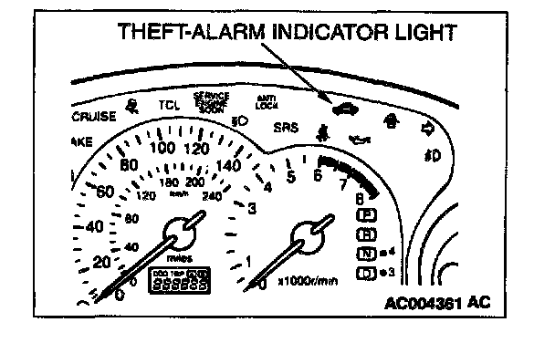 If an attempt is made to start the engine with an unregistered ignition key, cranking occurs, but fuel supply is cut off to disable the engine. In approx. 10 seconds, the theft-alarm indicator will blink for approx. 30 seconds.