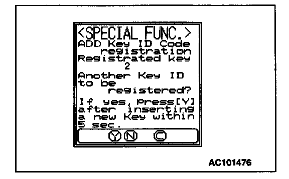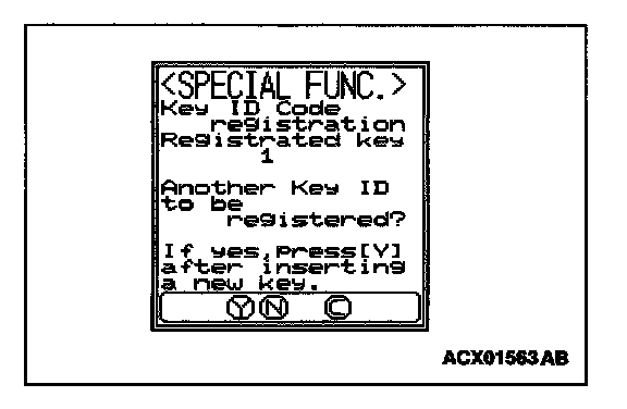 9. The number of keys currently registered will be displayed. To register an additional key, replace the ignition key with the next key to be registered within five seconds and then press the "YES" key. Key ID registration screen will be displayed, then register another key.