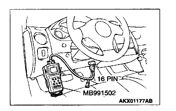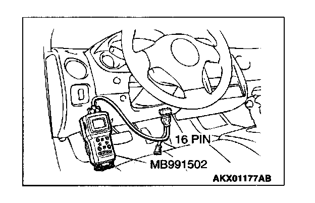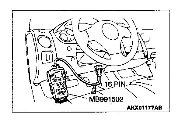 CAUTION: To prevent damage to scan tool MB991502, always turn the ignition switch to the "LOCK" (OFF) position before connecting or disconnecting scan tool MB991502.