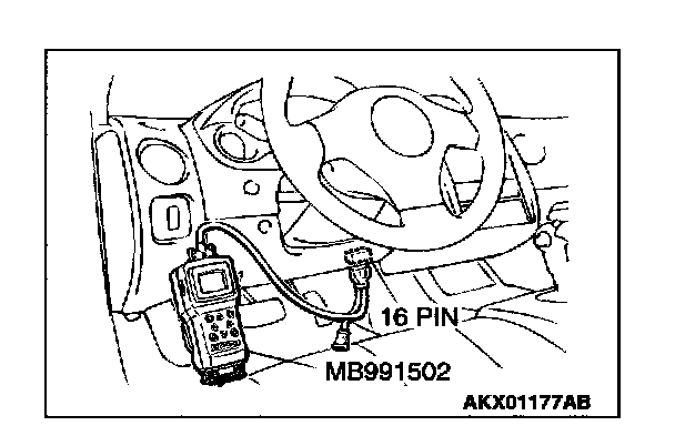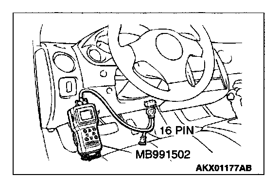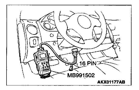 CAUTION: To prevent damage to scan tool MB991502, always turn the ignition switch to the "LOCK" (OFF) position before connecting or disconnecting scan tool MB991502.