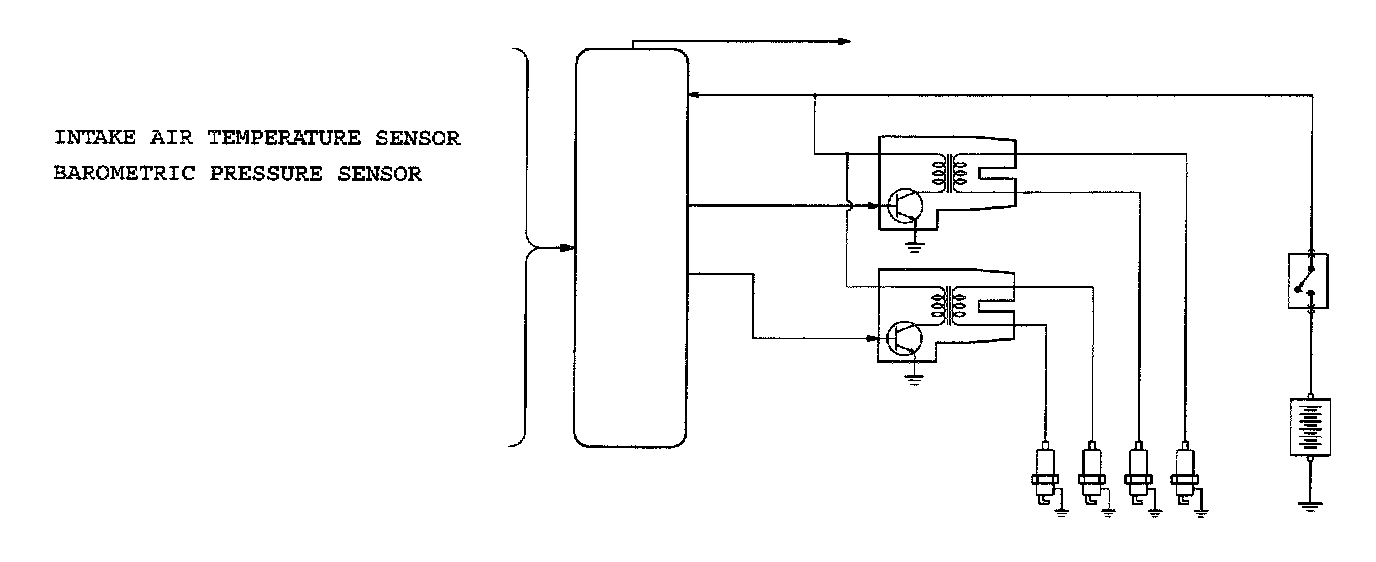 The engine control module controls the two ignition power transistors to turn them alternately ON and OFF. This causes the primary currents in the ignition coils to be alternately interrupted and allowed to flow to fire the cylinders in the order 1-3-4-2.