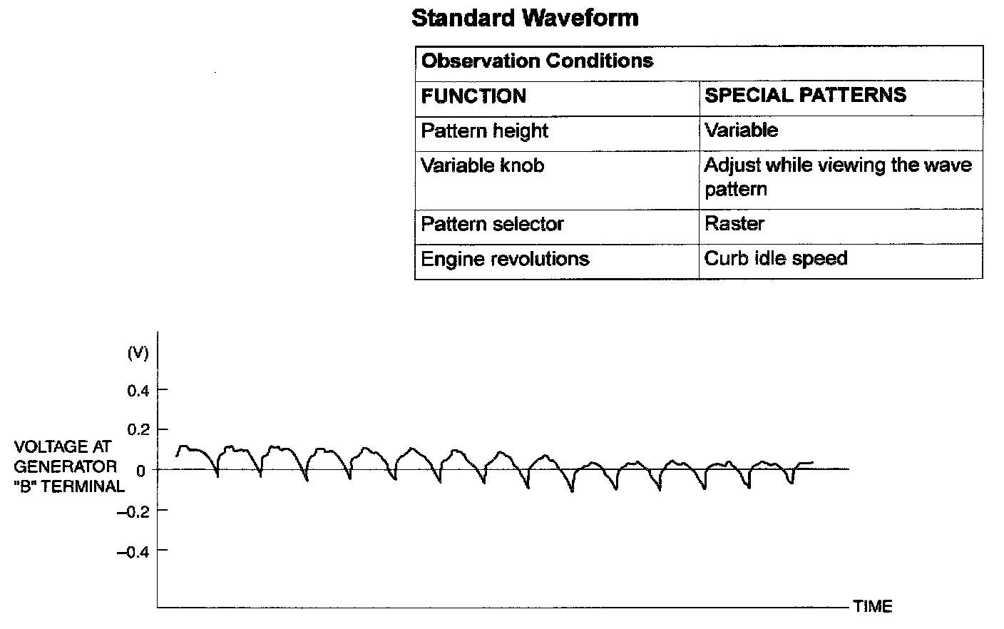 NOTE: The voltage waveform of the generator "B" terminal can undulate as shown. This waveform is produced when the regulator operates according to fluctuations in the generator load (current), and is normal for the generator. If the ripple height is abnormally high (approximately 2 V or more during idling), the wires between the generator B terminal and the battery have broken due to fuse blowing, etc. The generator is usually operating properly.