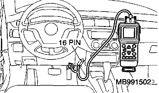 CAUTION: To prevent damage to scan tool MB991502, always turn the ignition switch to the "LOCK" (OFF) position before connecting or disconnecting scan tool MB991502.