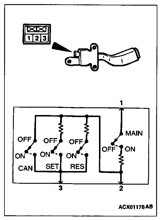 Measure the resistance between the terminals when each of the "SET" "RESUME" "CANCEL" and "MAIN" switches is pressed. If the values measured at the time correspond to those in the table, the resistance values are correct.