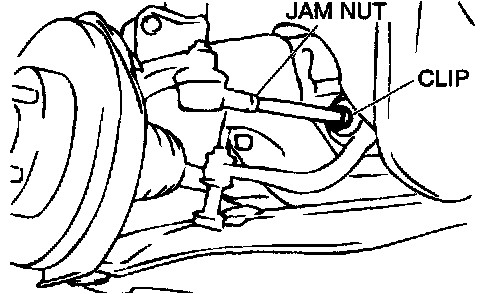 1. Adjust the toe-in by undoing the clip and jam nut, and turning the left and right tie rod turnbuckles by the same amount (in opposite directions).