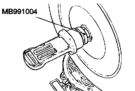 For vehicles with aluminum type wheels, attach the camber/caster/kingpin gauge to the driveshaft by using special tool MB991004. Tighten special tool MB991004 to the same torque 245 ± 29 Nm (181 ± 21 ft. lbs.) as the driveshaft nut.