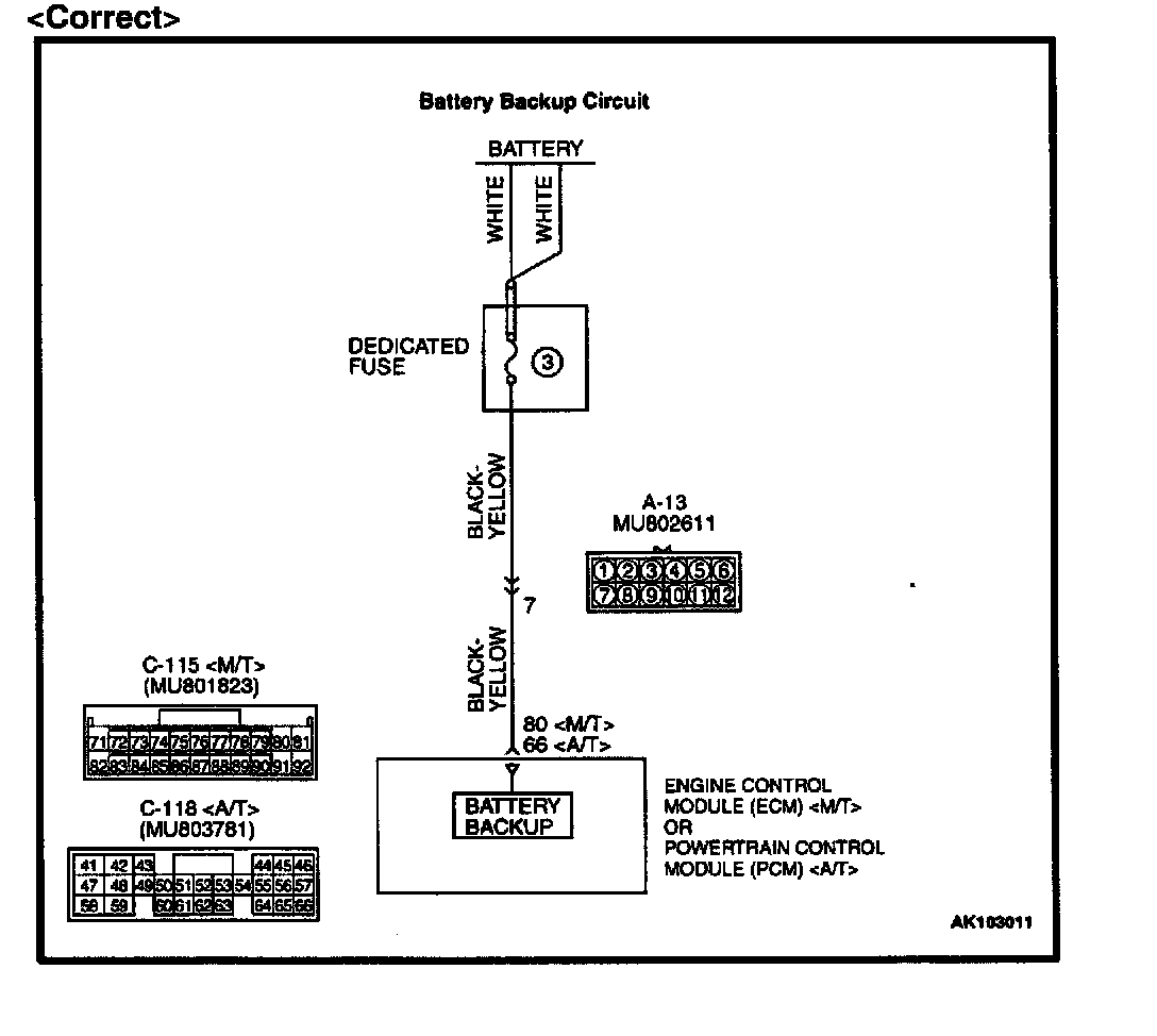 This bulletin contains corrections to the backup power supply circuit for the engine control module (ECM) and powertrain control module (PCM). These corrections affect both the manual transmission (ECM) and automatic transmission (PCM) equipped vehicles.