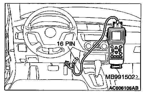 CAUTION: To prevent damage to scan tool MB991502, always turn the ignition switch to the "LOCK" (OFF) position before connecting or disconnecting scan tool MB991502.
