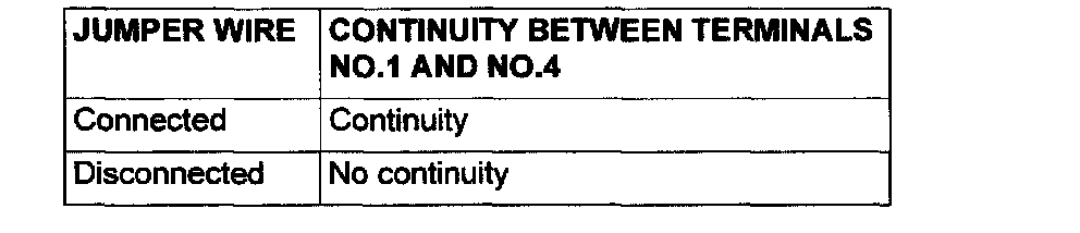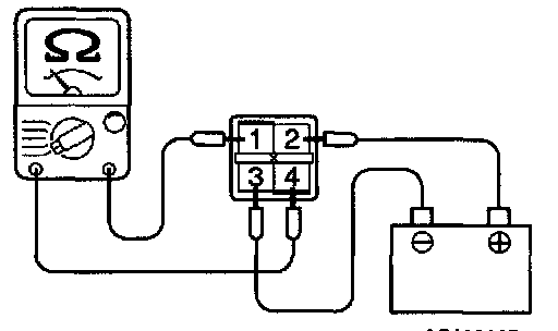 3. Check the continuity between terminal 1 and terminal 4 of the A/T control relay when the jumper wires are connected to and disconnected from the battery.