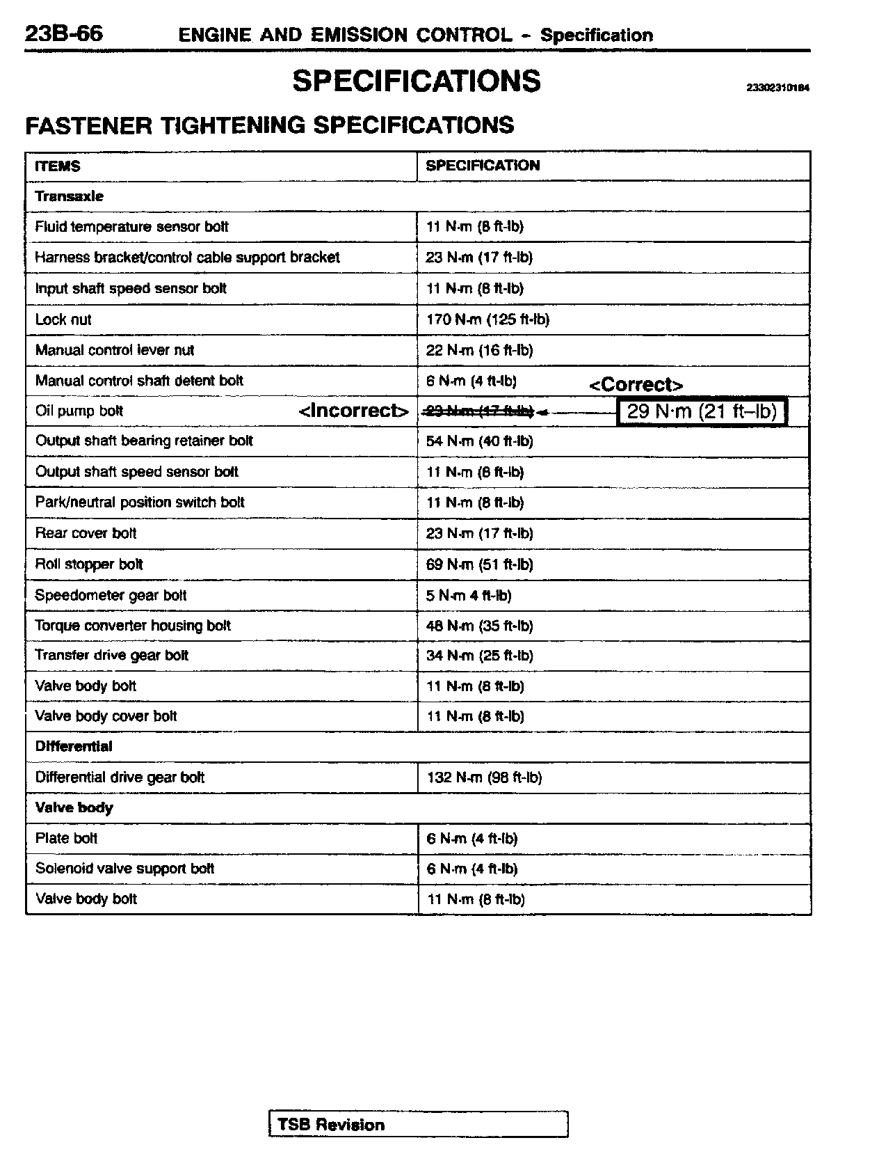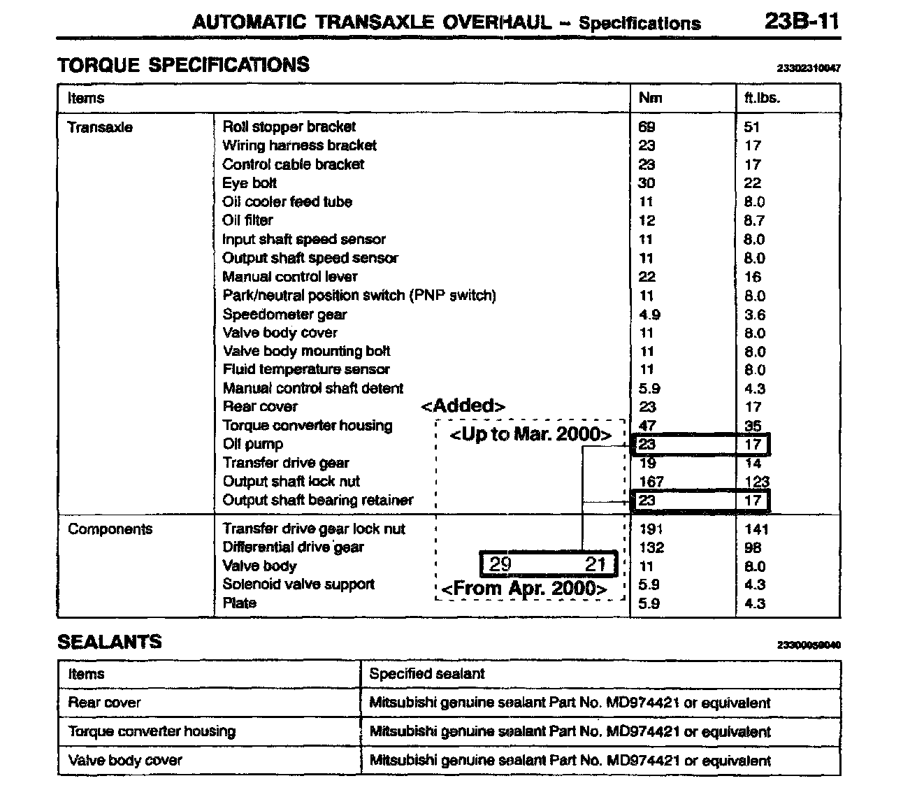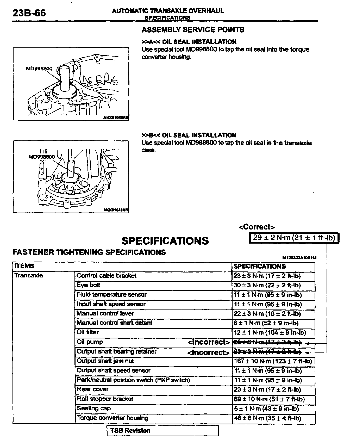 This bulletin revises the tightening torque values for the transmission output shaft retainer bolts and the transmission oil pump mounting bolts. These torque values were changed beginning with April, 2000 production.