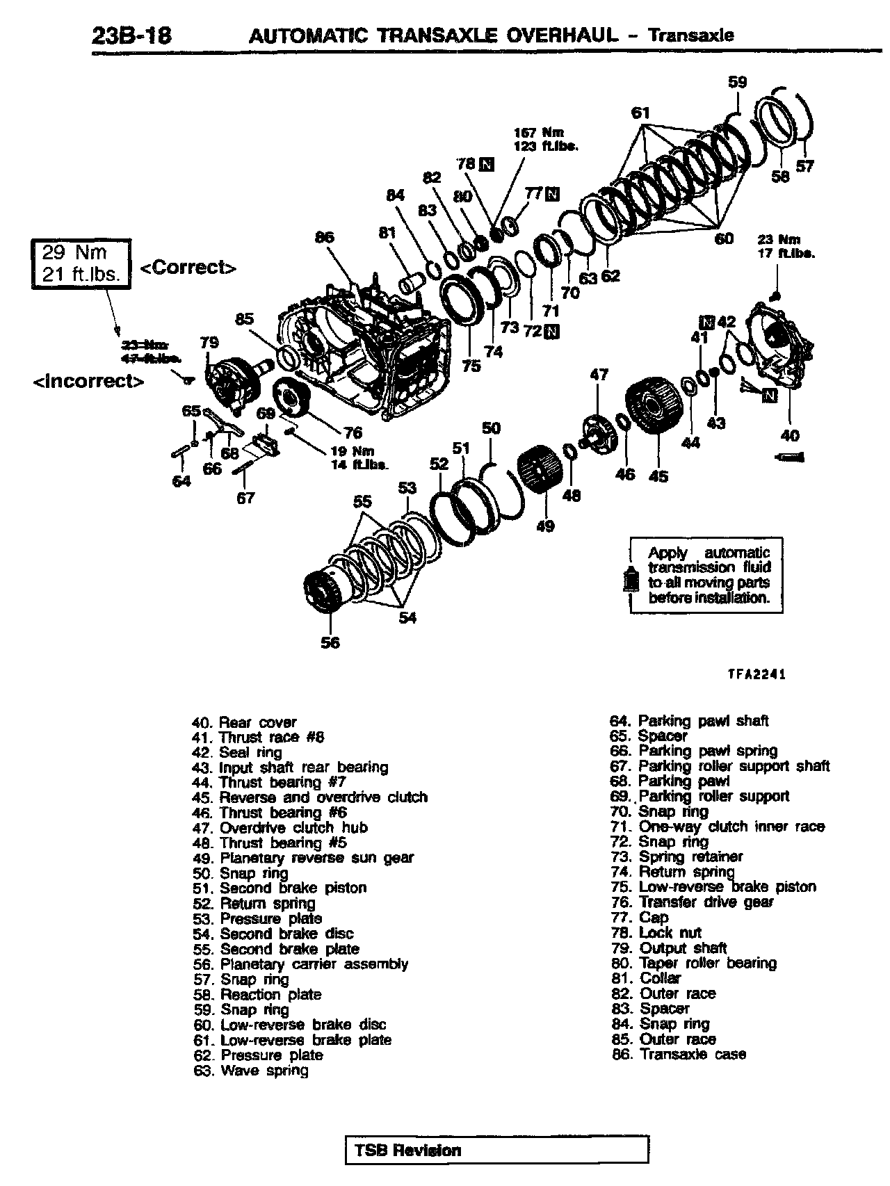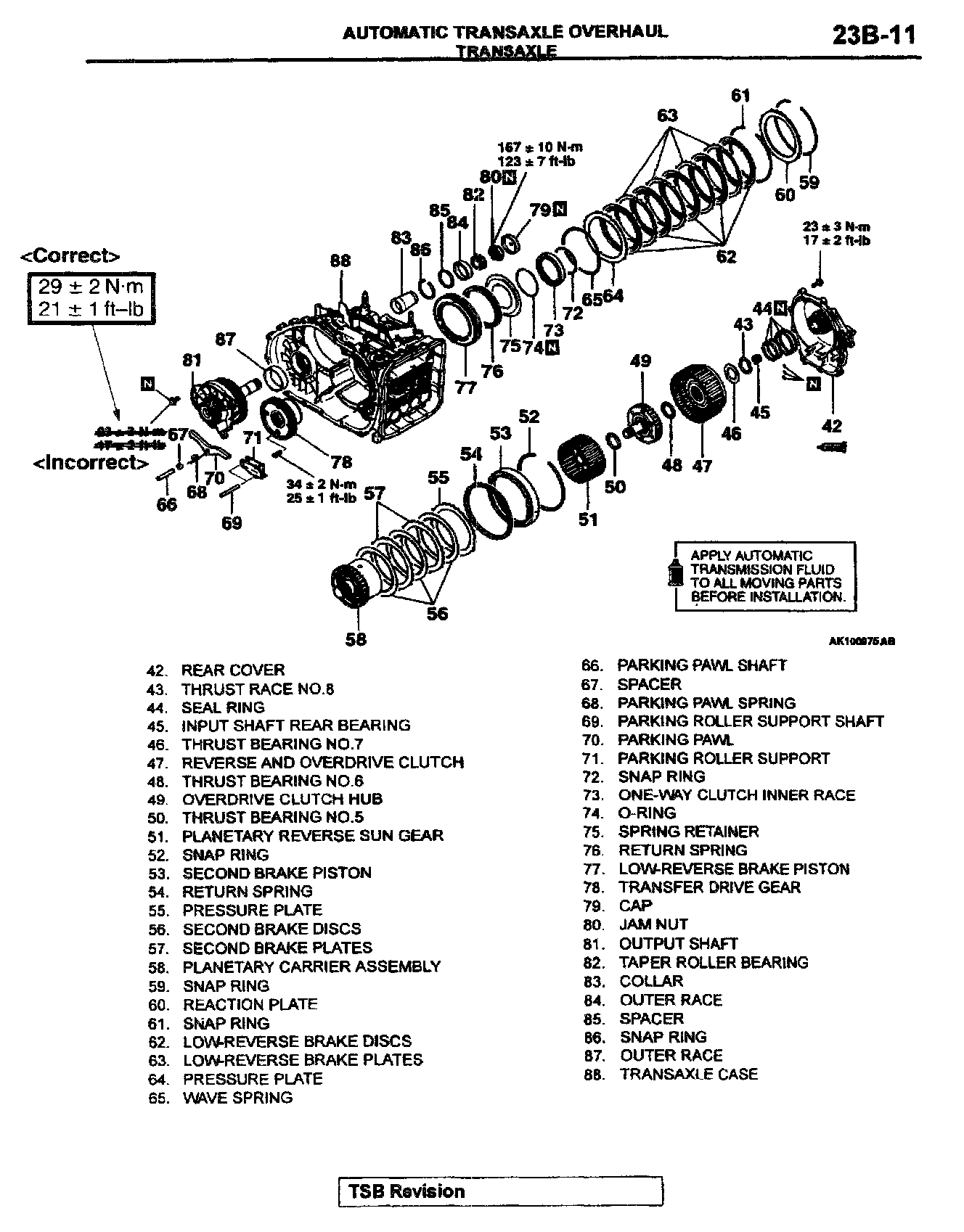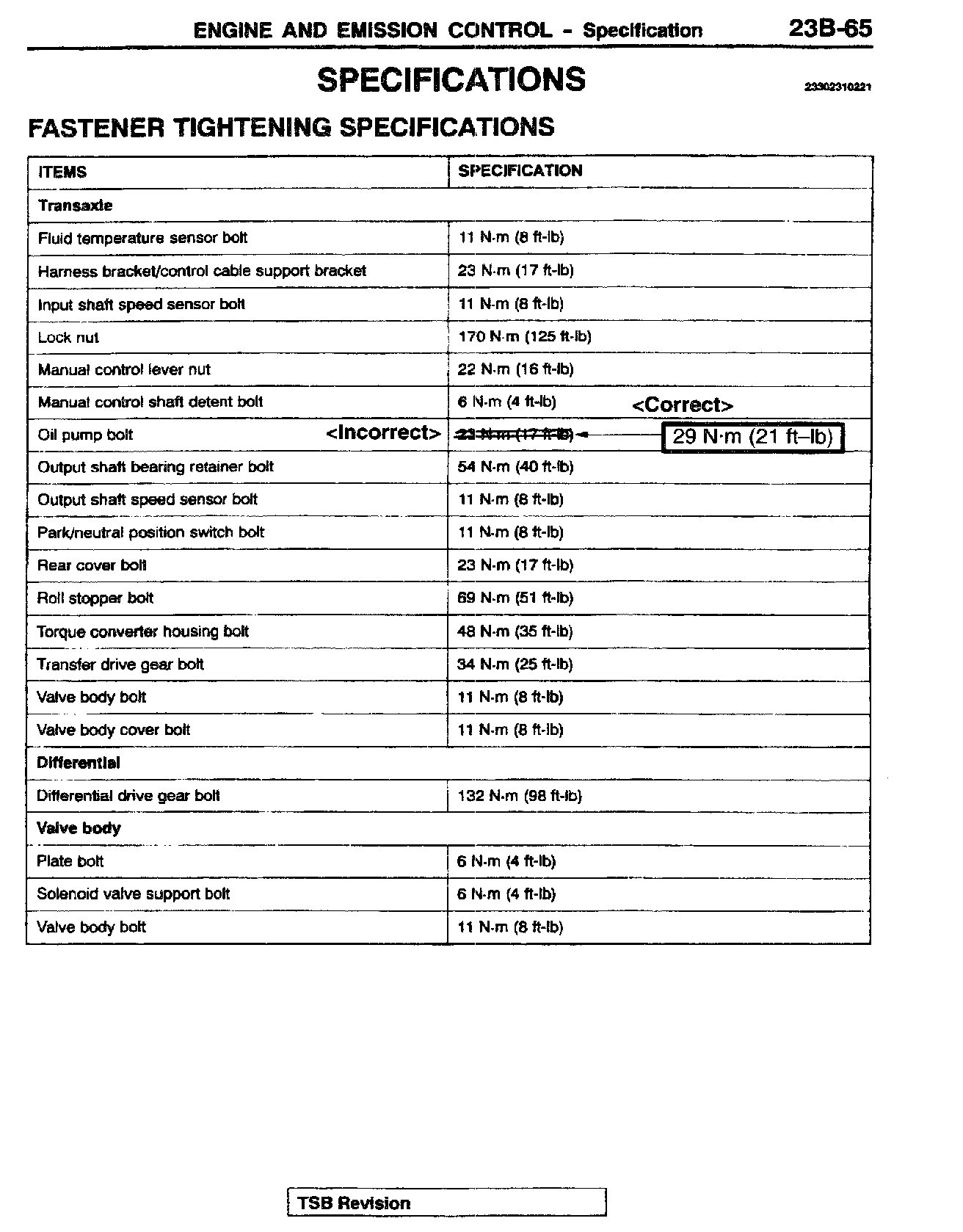 This bulletin revises the tightening torque values for the transmission output shaft retainer bolts and the transmission oil pump mounting bolts. These torque values were changed beginning with April, 2000 production.