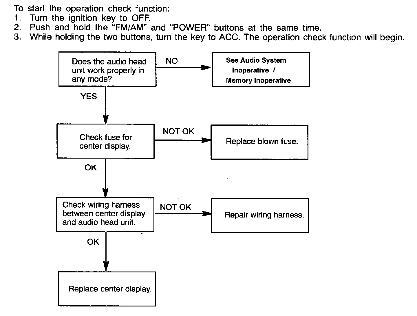 The head unit has an operation check function which allows it to work by itself, without being connected to the center display. If the problem is in the center display, the audio head unit may also appear to have a problem. This function can be used to confirm proper audio unit operation independent of the center display.