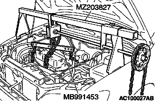 Set the special tools MB991453 and MZ03827 to the vehicle to support the engine assembly