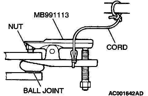^ Use special tool MB991113 to loosen the tie rod end mounting nut. Only loosen the nut, do not remove it from the ball joint.