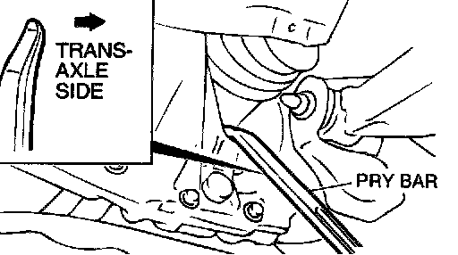 1. Insert a pry bar between the transaxle case and the driveshaft as shown to remove the driveshaft.