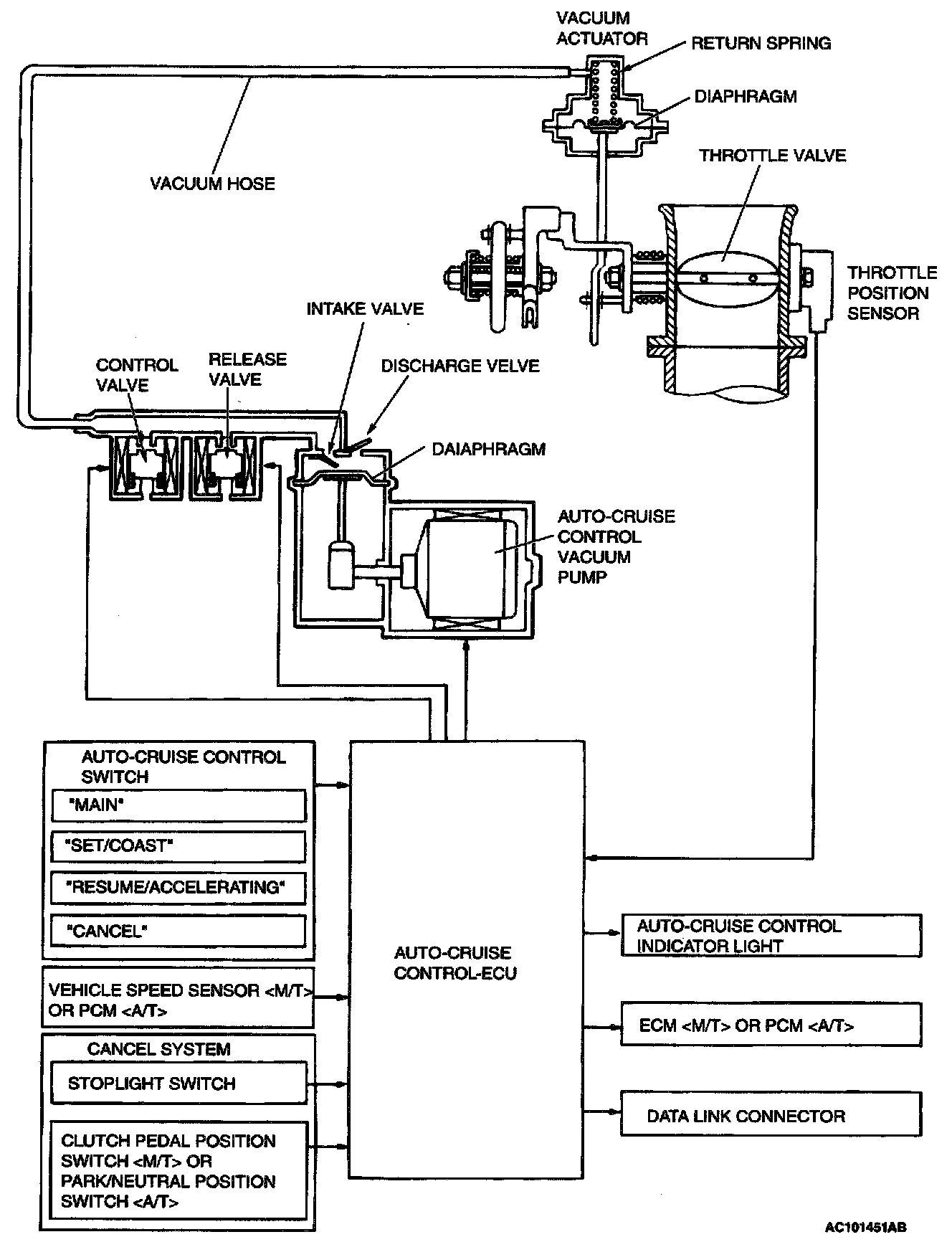 Basically the system is the same as the previous type, but on A/T models the power control module (PCM) sends a vehicle signal to the auto-cruise control- ECU.
