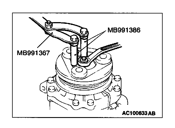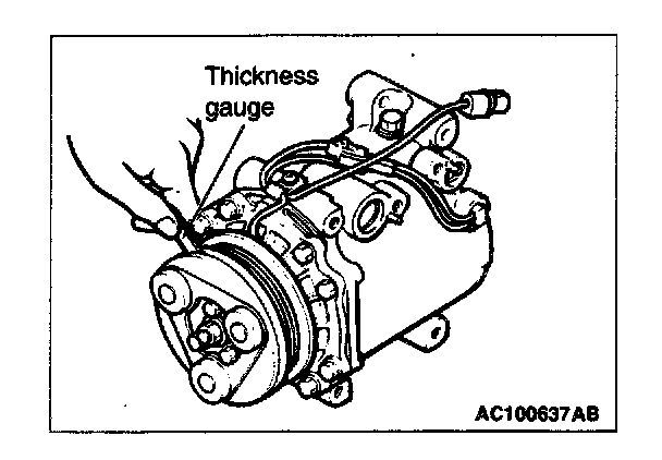 Apply voltage from the battery to the magnetic cliche and check that the clutch air gap is inside the standard value. If outside the standard value, use a shim to adjust the gap.