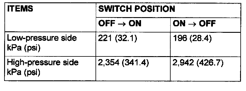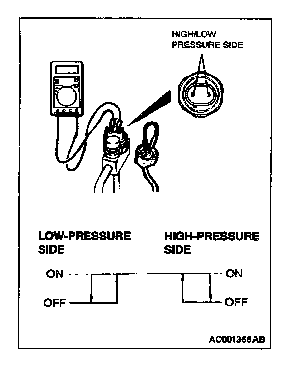 3. When the high/low pressure sides of the dual pressure switch are at operation pressure (ON) and there is continuity between the respective terminals, then the condition is normal. If there is no continuity, replace the switch.