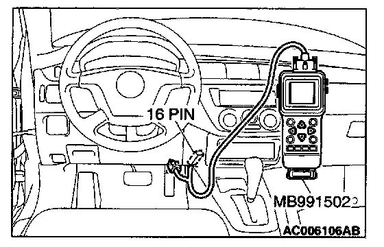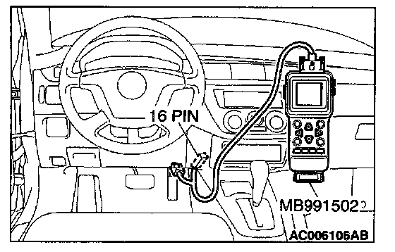 CAUTION: To prevent damage to scan tool MB991502, always turn the ignition switch to the "LOCK" (OFF) position before connecting or disconnecting scan tool MB991502.