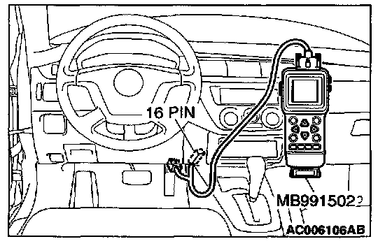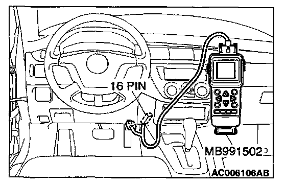 CAUTION: To prevent damage to scan tool MB991502, always turn the ignition switch to the "LOCK" (OFF) position before connecting or disconnecting scan tool MB991502.