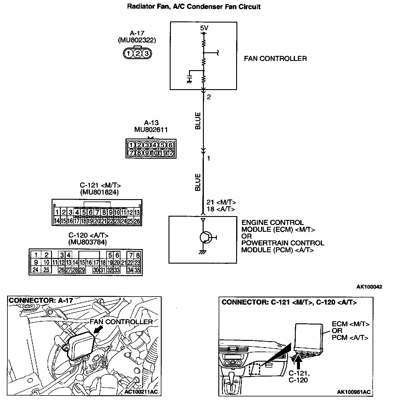 STEP 3. Check for open circuit and short circuit to ground and harness damage between fan controller A-17 terminal 2 and ECM connector C-121 terminal 21 or PCM connector C-120 terminal 18 .