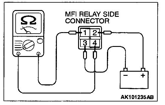 4. Check the continuity between the MFI relay terminals 1 and 4 while connecting and disconnecting the jumper wire at the negative battery terminal.