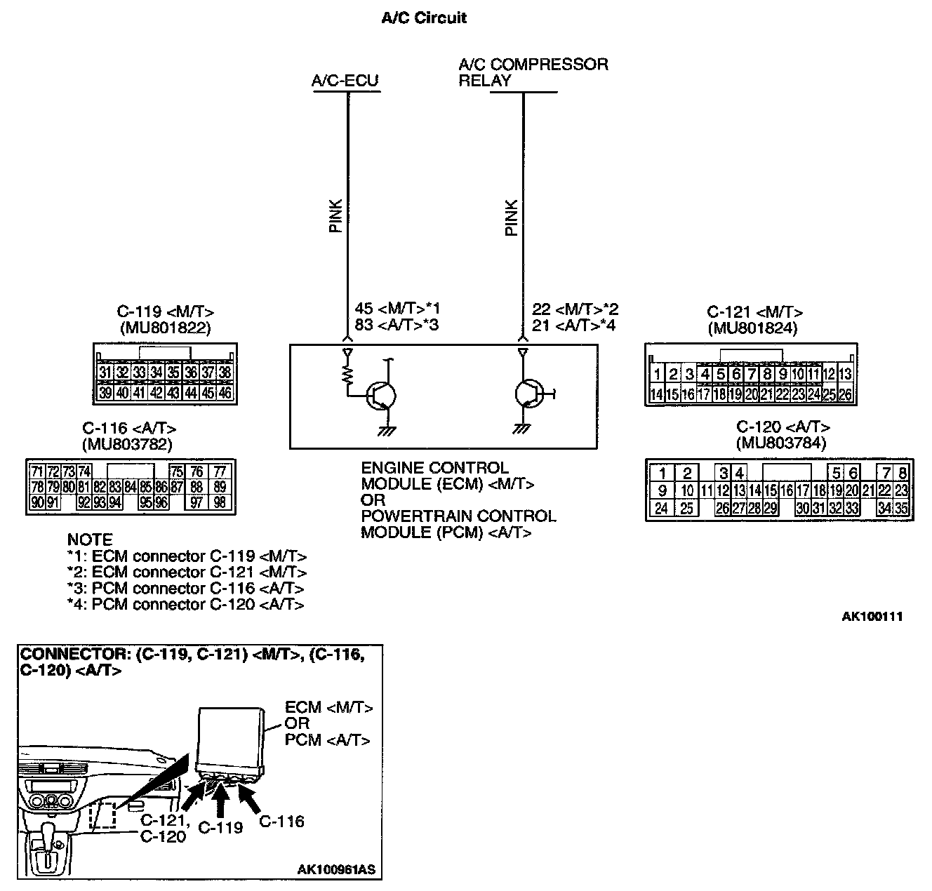 - when the A/C is "ON", the battery positive voltage is applied on the ECM (terminal 45)