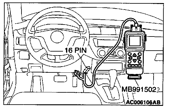 ignition switch to the "LOCK" (OFF) position before connecting or disconnecting scan tool MB991502.
