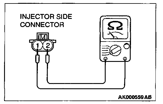 2. Measure the resistance between each injector side connector terminal 1 and 2.