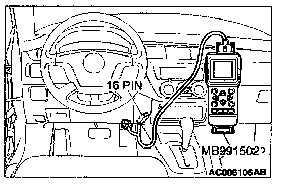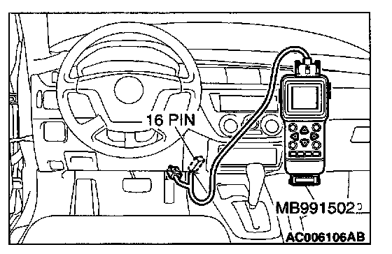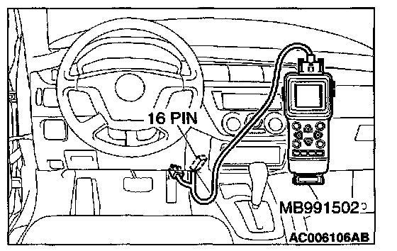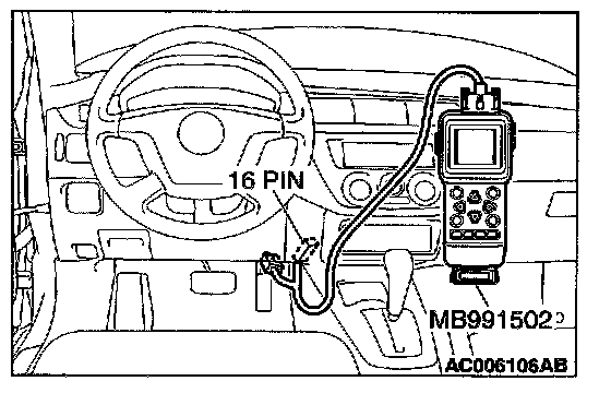 CAUTION: To prevent damage to scan tool MB991502, always turn the ignition switch is to the "LOCK" (OFF) position before connecting or disconnecting scan tool MB991502.