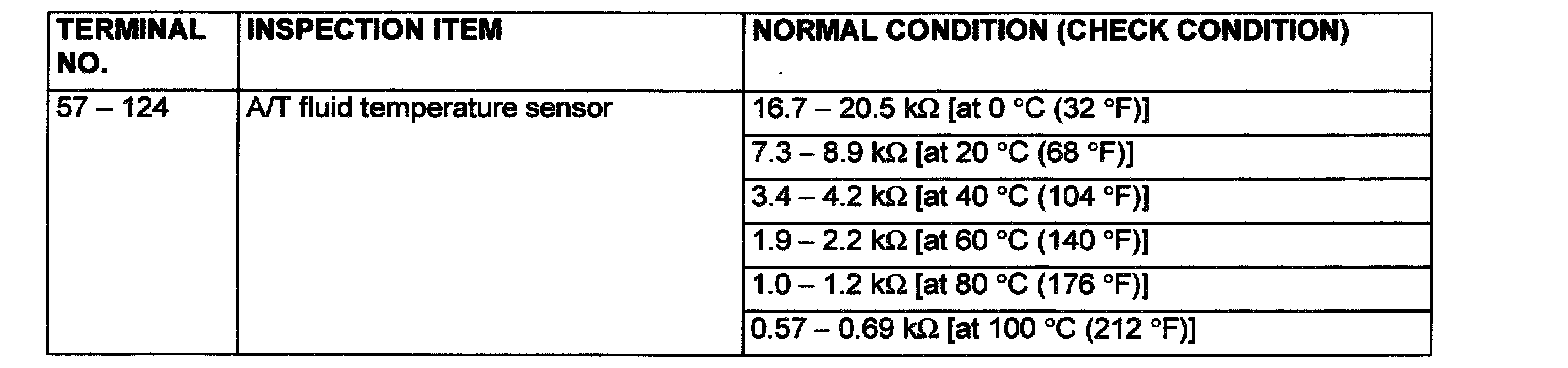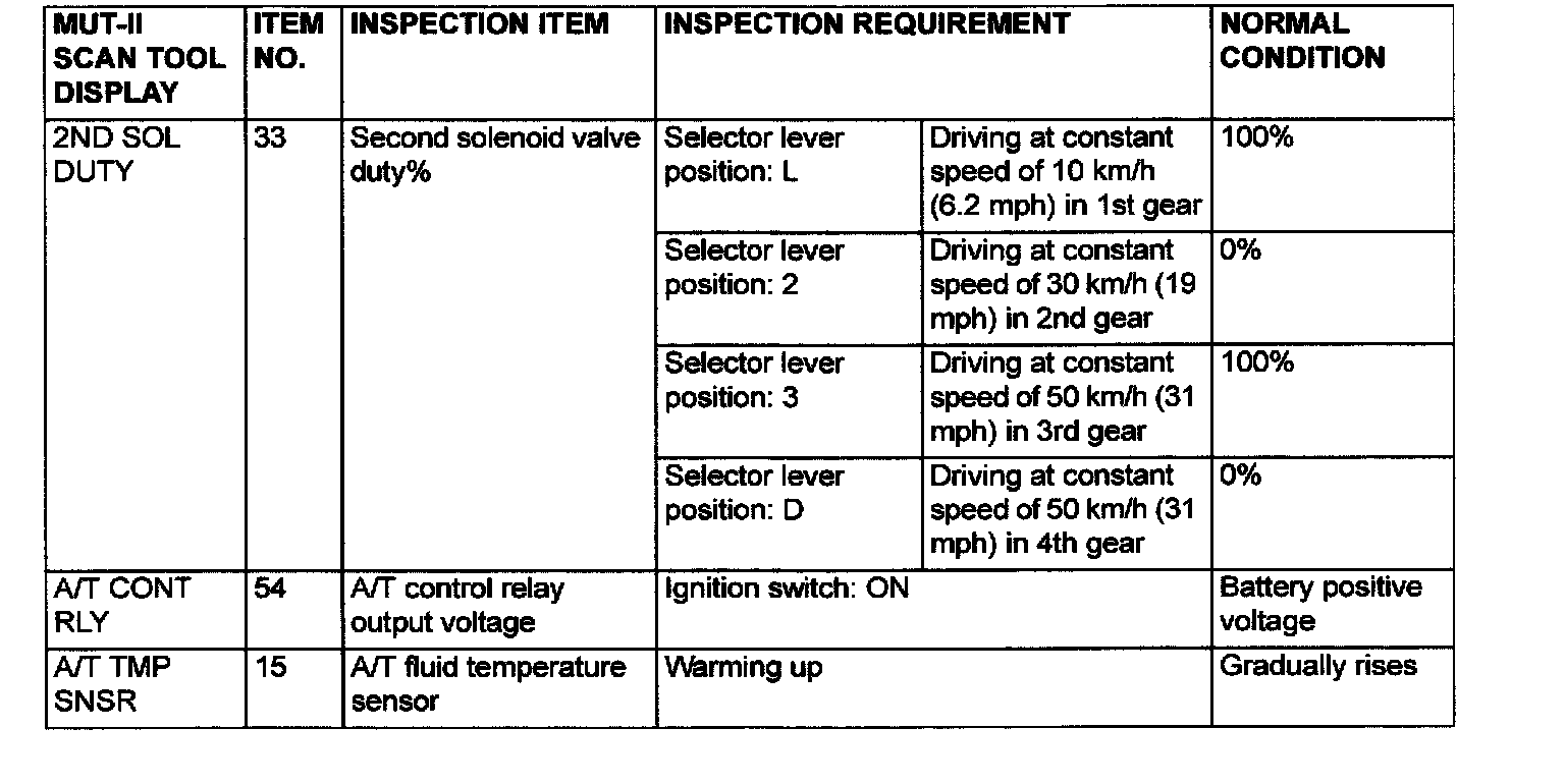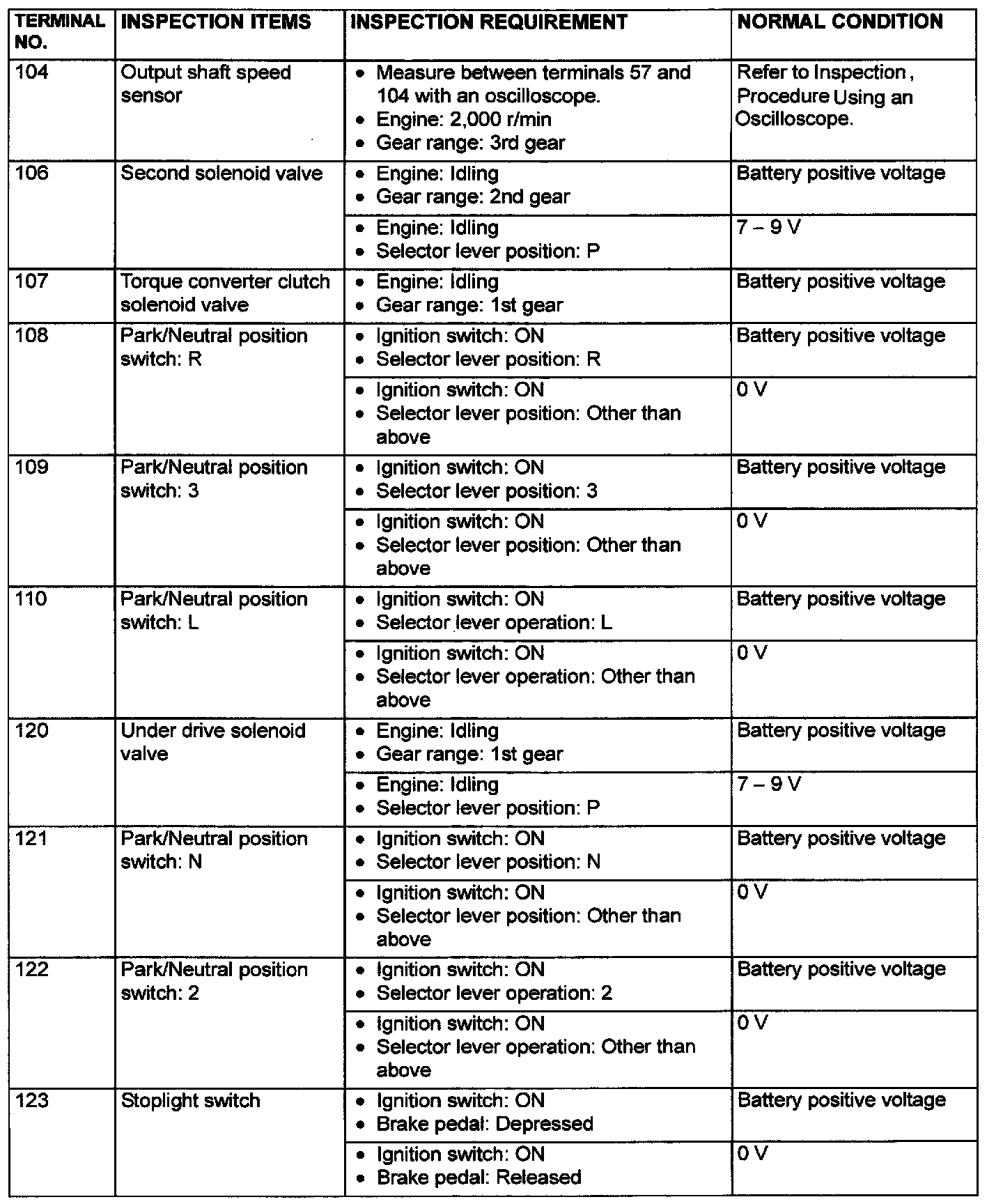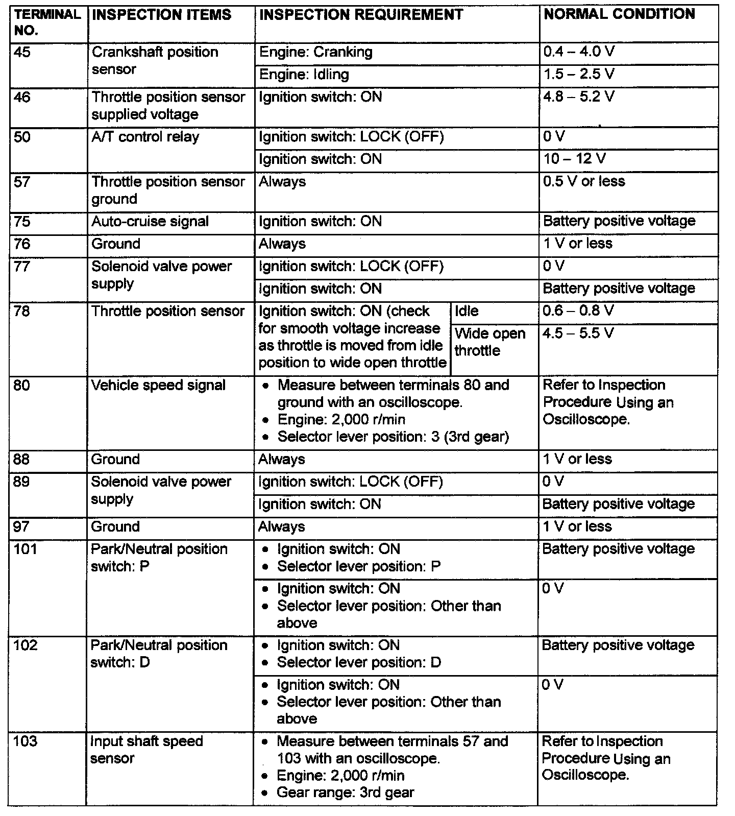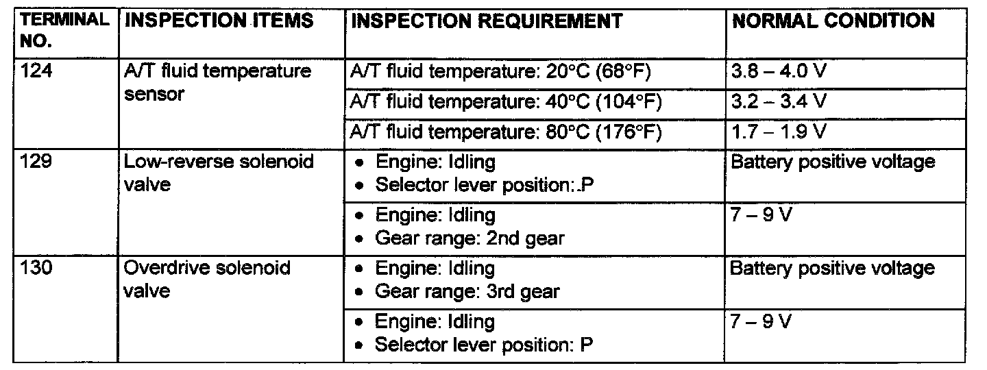 PCM TERMINAL VOLTAGE REFERENCE CHART FOR TRANSAXLE OPERATION