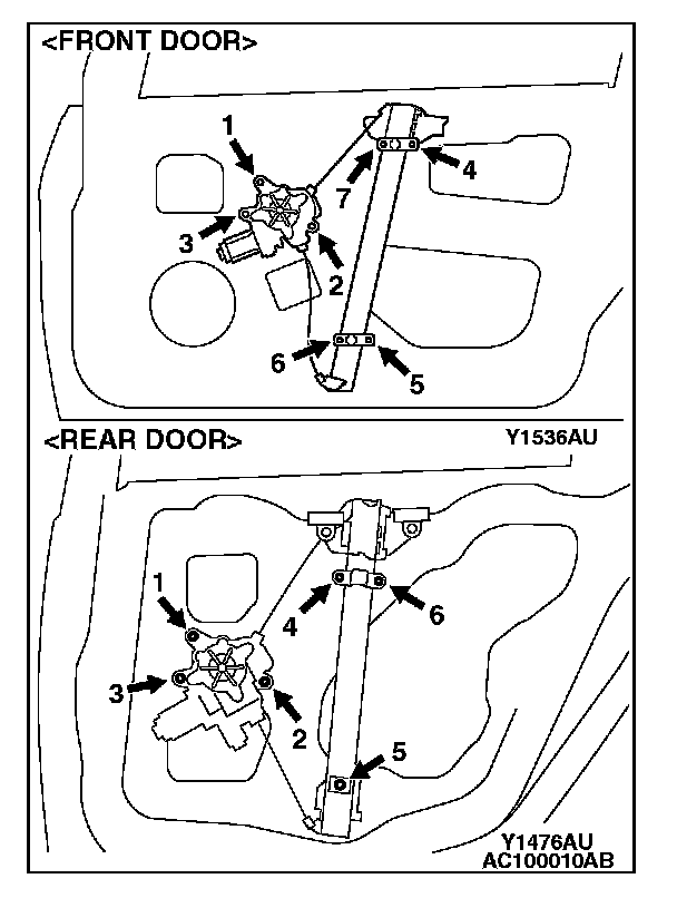 When installing the window regulator assembly, tighten the bolts to the specified torque in the order shown.