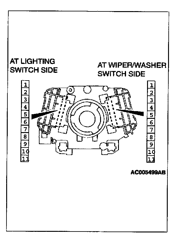 2. Among individual connectors of the column switch body remaining in the steering column, check for continuity between same number terminals (No. 3-11).