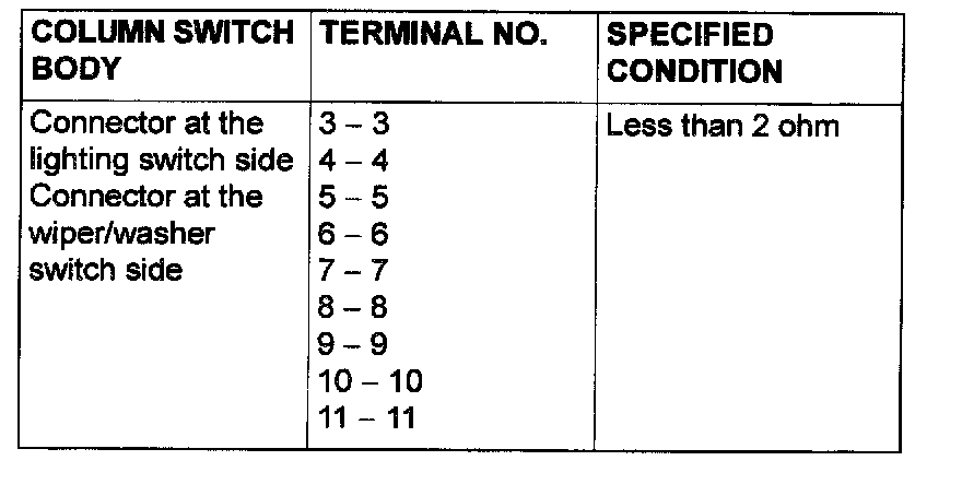 COLUMN SWITCH CONTINUITY CHECK (AT SWITCH BODY)