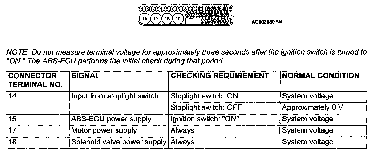 NOTE: Do not measure terminal voltage for approximately three seconds after the ignition switch is turned to "ON. The ABS-ECU performs the initial check during that period.