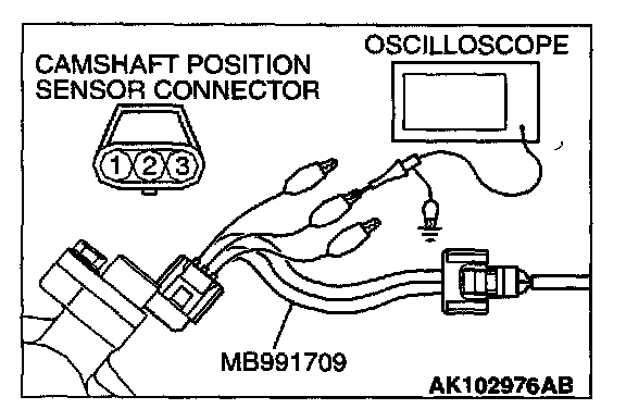 1. Disconnect the camshaft position sensor connector, and connect the test harness special tool (MB991709) in between. (All terminals should be connected.)