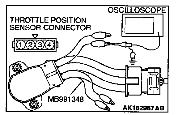 1. Disconnect the throttle position sensor connector and connect the test harness special tool (MB991348) in between.(All terminals should be connected.)