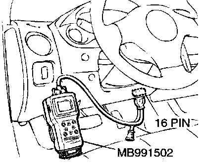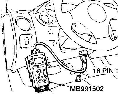 CAUTION: To prevent damage to scan tool MB991502, always turn the ignition switch to the "LOCK" (OFF) position before connecting or disconnecting scan tool MB991502.
