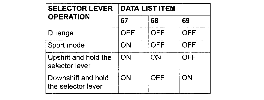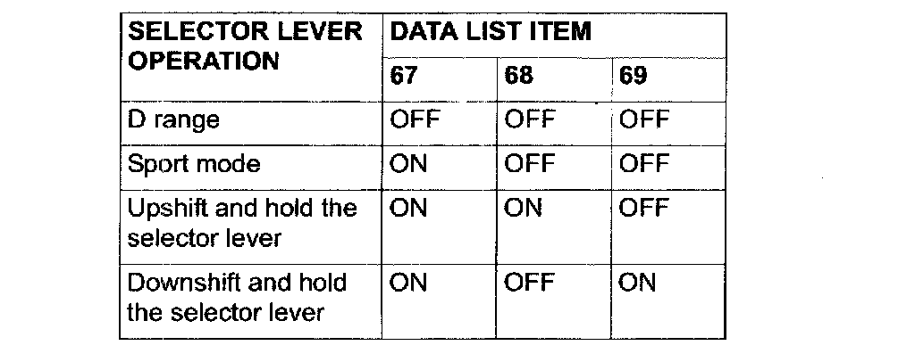 If the select switch of the shift switch assembly is set to the sport mode, battery positive voltage will be applied to the PCM (terminal number 109). If the shift switch of the shift switch assembly is set to "UP" or "DOWN" position, battery positive voltage will be applied to the PCM (terminal number 122, 110).