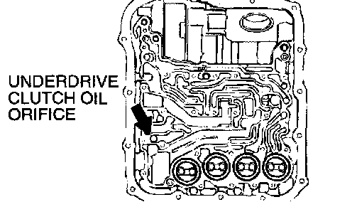 2) Blow 108 kPa (15 psi) compressed air into the underdrive clutch oil orifice of the transaxle case, and check if the underdrive clutch piston moves and air pressure is maintained in that condition.