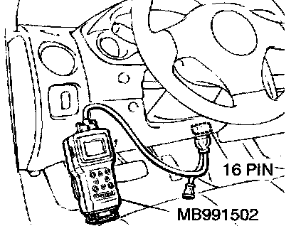 CAUTION: To prevent damage to scan tool MB991502, always turn the ignition switch to the "LOCK" (OFF) position before connecting or disconnecting scan tool MB991502.