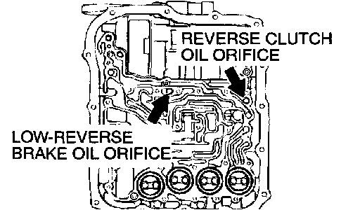 2) Blow 108 kPa (15 psi) compressed air into the reverse clutch oil orifice of the transaxle case. Then check if the reverse clutch piston moves and air pressures are maintained in that condition. Repeat for the low-reverse brake.