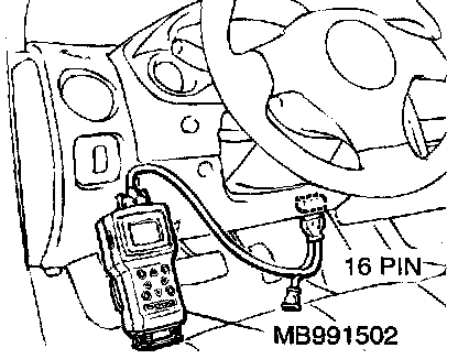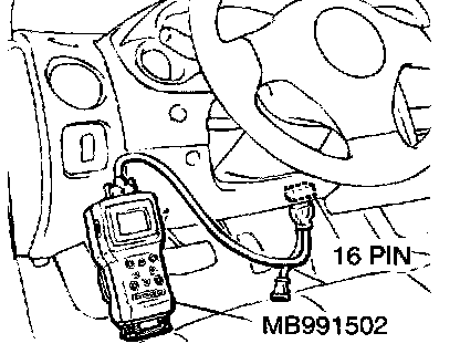 CAUTION: To prevent damage to scan tool MB991502, always turn the ignition switch to the "LOCK" (OFF) position before connecting or disconnecting scan tool MB991502.